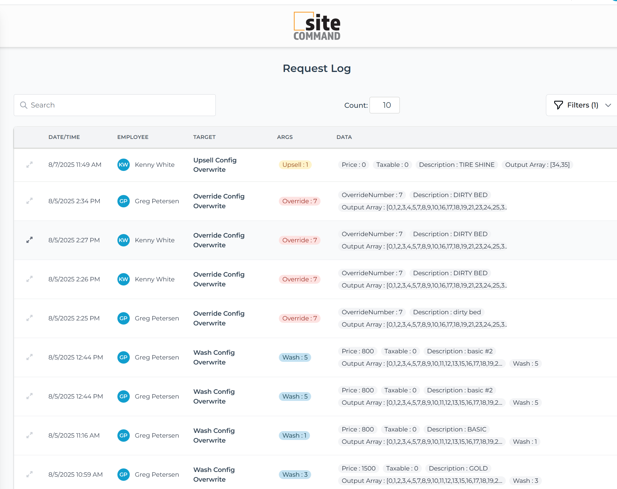 This is the system's "history book". Request logs are a transparent audit trail that records every configuration change made by employees by displaying Time, Employee, Target, Argument, and Data. The purpose of this page is to track all system configuration changes (outputs, wash packages, overrides, etc.), who made the change, when it happened, and what was changed. It also provides accountability and a reference point for troubleshooting and training.
