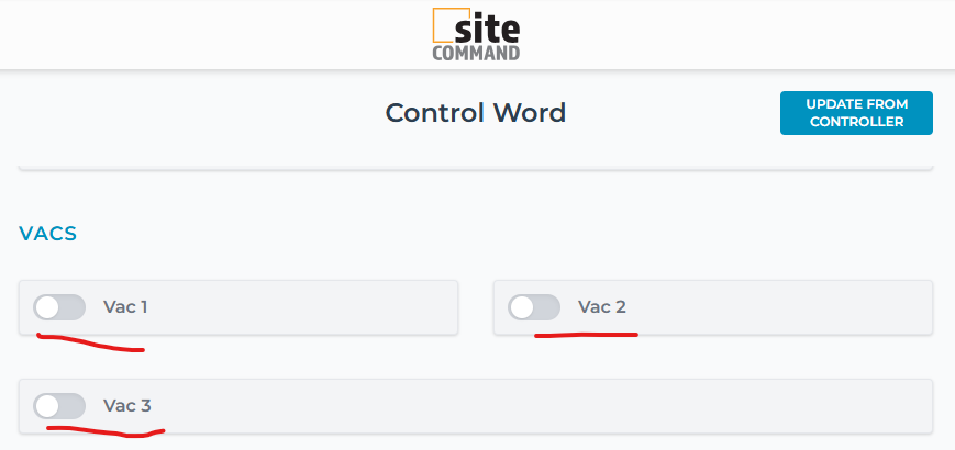 Vac 1, 2 and 3 Toggles are for telling the Controller that the supplied Vacuums attached are "Ready and Operational". These are to be enabled after Installation and everything is ready to go so the Controller logic network doesn't spend computation constantly looking for the Vacuum Network Targets if they are not there. This ensures Controller Network and CPU runtime stability.