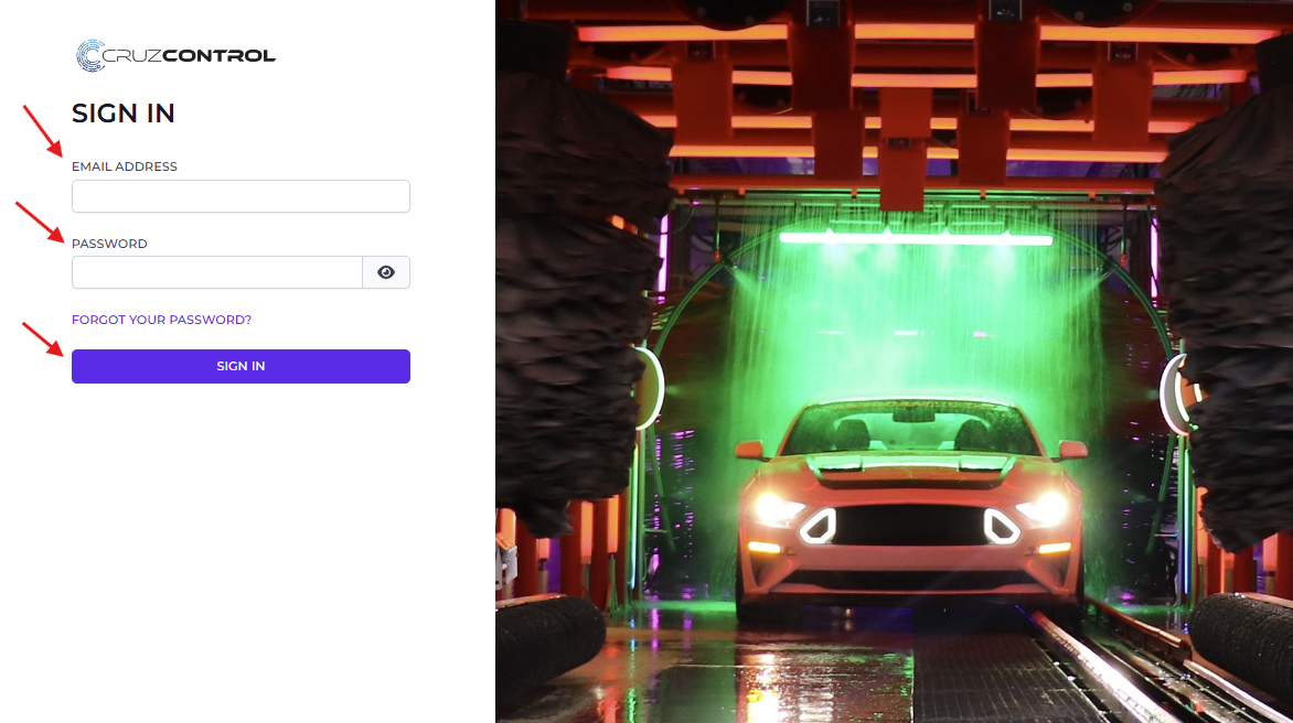 Enter the email address you've provided CruzControl during your Client Success on boarding process, or that provided you by your car wash's owner. Enter your password and then click Sign In.