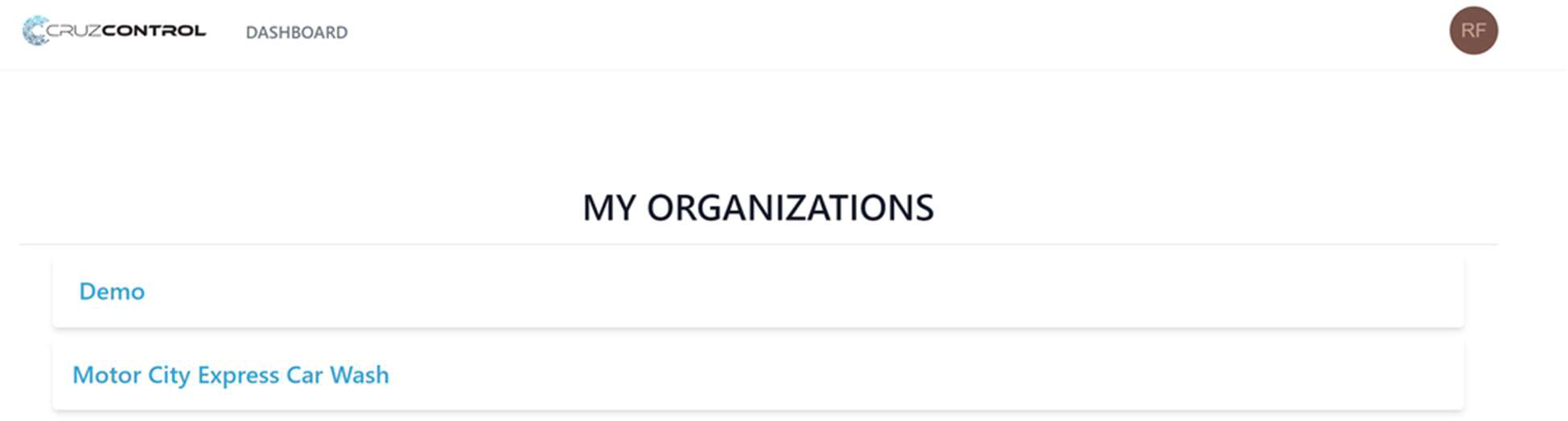 Once logged in, select your tenant. Note that tenants listed here will vary upon your access level. In most cases, as a car wash owner, you'll only see one choice. Here we're showing two as this logged in user has access to both the Demo and Motor City Express Car Wash tenants