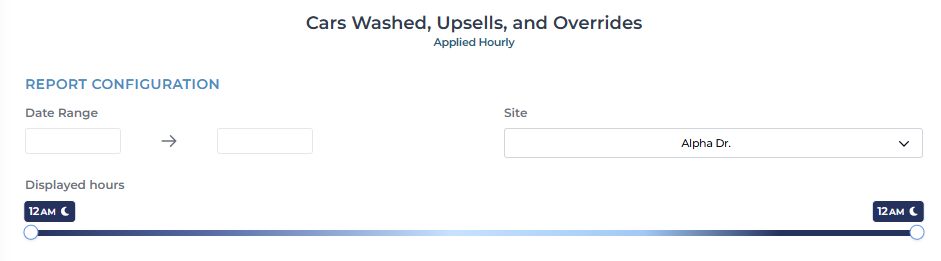 This hourly report allows the user to specify a date range and a consecutive hour of day window, and view all packages washed, upsells sold, overrides applied during that time period, broken out by hour of the day. This is a useful tool for detecting busy and slow hours within a day.