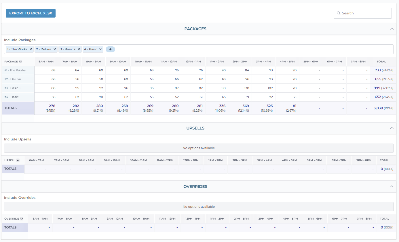 If you'd like to limit the results by a particular package, upsell or override, you may begin typing the name of the item. The report will update to only include data relevant to your search criteria.