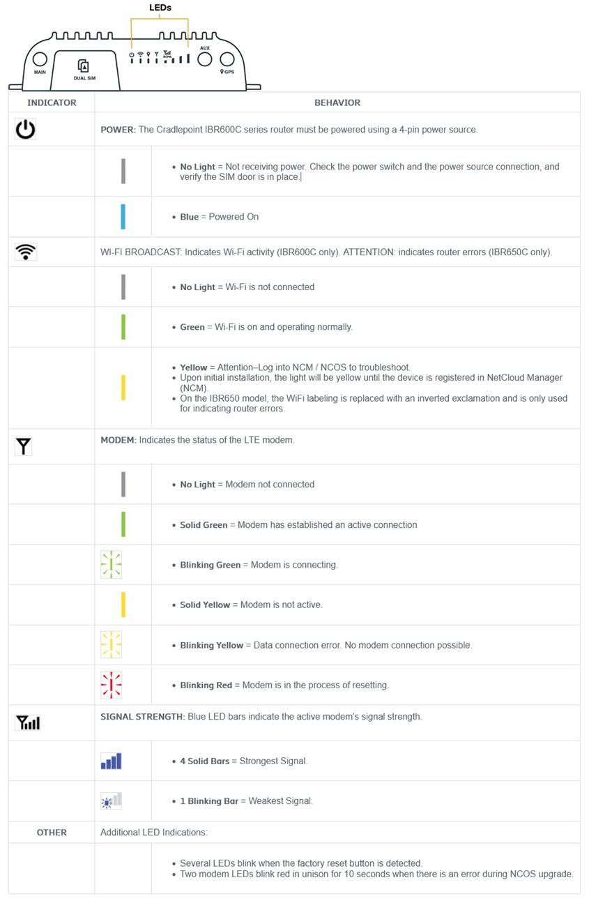 The IBR600C series routers use LED lights to communicate various status conditions. Use the chart below to verify the status of your router after the boot up cycle.